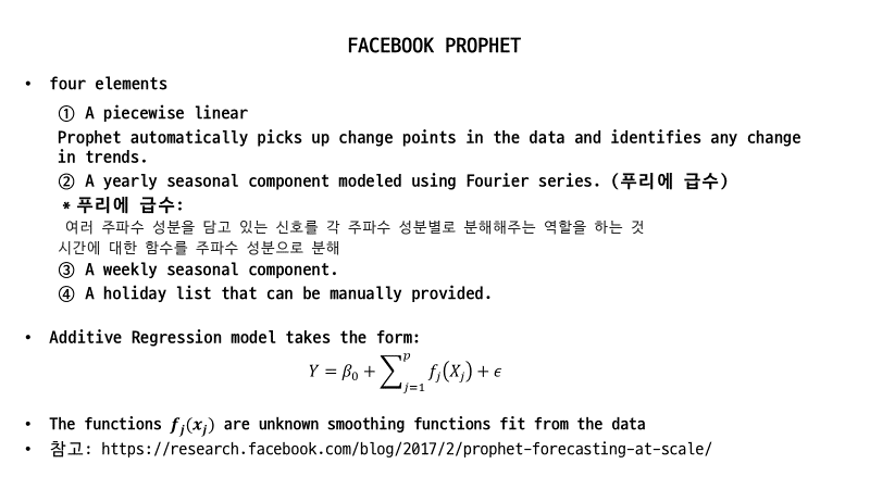 연도별, 주별 그리고 일별 계절성 추가적으로 휴일 효과에 맞는 비선형 추세의 가법 모형을 기반으로 시계열 데이터를 예측하는 절차이다.